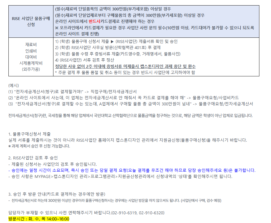 나. 집행방법 : 전자세금계산서 청구(국민대학교 산학협력단 209-82-08395로 발행), RISE사업단 사업비 카드(상세내용 붙임 자료 확인)